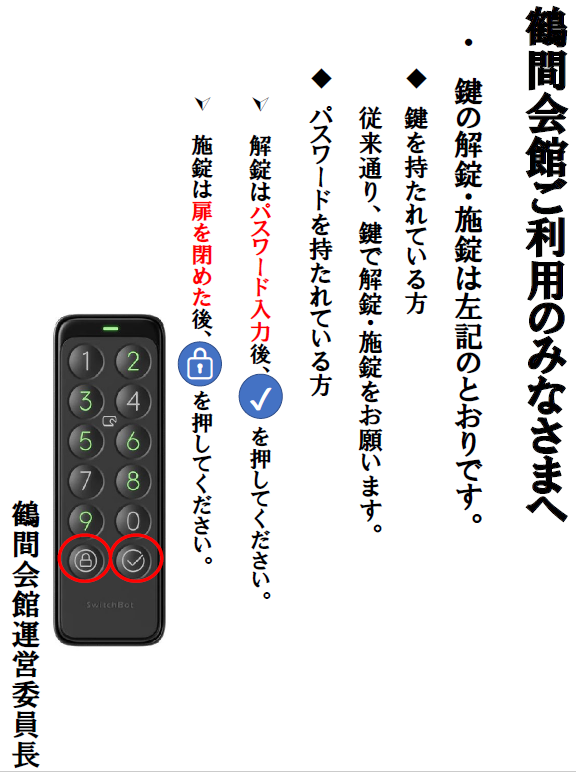 鶴間会館の鍵取扱いについて 2023.03.172023.04.27 鶴間会館 鶴間会館をご利用の際に必要となる鍵についてご案内します。 会館の鍵を開けるには 鶴間会館では、暗証番号で鍵を開けるシステムを導入しています。予約を完了した際に鍵解錠暗証番号を通知いたします。この情報は他者に渡さないようにお願いいたします。 鍵を解錠する場合 鍵を施錠する場合